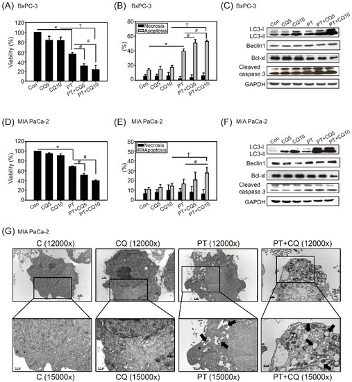 Synergistic cytotoxic effects of PT combined with the autophagy inhibitor chloroquine (CQ). Dose-dependent cytotoxic effects of CQ (5, and 10 μM) and PT (100 μM) treatment alone or in combination (PT + CQ) in (A) BxPC-3 cells and (D) MIA PaCa-2 cells for 48 h, analyzed via MTT assay. The data are presented as the means ± SEM of three independent experiments. * p < 0.05 compared to the control group; # p < 0.5 compared to the PT treatment alone groups; † p < 0.05 compared to the CQ 10 μM groups. Necrosis and apoptosis were analyzed via flow cytometry with Annexin V/PI in (B) BxPC-3 and (E) MIA PaCa-2 cells that were treated with CQ and PT—alone or in combination—for 48 h. The data are presented as the mean ± SEM; n = 3. * p < 0.05 compared to the control group; # p < 0.5 compared to the PT treatment alone groups; † p < 0.05 compared to the CQ 10 μM groups. Autophagy accumulation in (C) BxPC-3 and (F) MIA PaCa-2 cells after treatment with CQ alone or PT combined with CQ was analyzed by the expression of LC3-I and LC3-II, via Western blot analysis. Apoptosis-inducing effects were analyzed by the expression of Bcl-xl and cleaved caspase-3. The membrane was probed with anti-GAPDH to confirm equal loading of proteins. Immunoblots are representative of at least three independent experiments. (G) Electron micrograph of MIA PaCa-2 cells treated with 10 μM CQ and 100 μM PT—alone or in combination—for 48 h (C, CQ, PT, and PT + CQ, 12,000× magnification; and C/2, CQ/2, PT/2, and PT + CQ/2, 15,000× magnification). The arrows indicate autophagic vacuoles and autolysosomes. Scale bar = 1 μm.