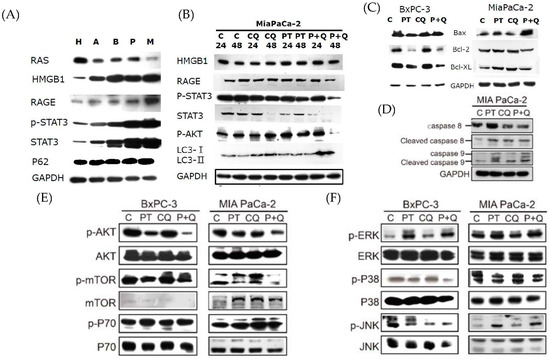 PT combined with CQ downregulates autophagy and the RAGE/STAT3 signaling pathways, leading to apoptosis: (A) The RAS, HMGB1, RAGE, p-STAT3, STAT3, and p62 protein expression in HPDE normal human pancreatic cells (H) and in AsPC-1 (A), BxPC-3 (B), PANC-1 (P), and MIA PaCa-2 (M) pancreatic cancer cells. (B) The effects of CQ and PT treatment—alone or in combination—for 24 and 48 h on the expression of HMGB1, RAGE, p-STAT3, STAT3, and LC3-I/II in MIA PaCa-2 cells. (C,D) BxPC-3 cells and MIA PaCa-2 cells were treated with CQ and PT—alone or in combination—for 48 h; the apoptosis-related proteins Bax, Bcl-2, and Bcl-xl were detected in both cell lines, and caspase-8, cleaved caspase-8, caspase-9, and cleaved caspase-9 were detected in MIA PaCa-2 cells. (E,F) The signaling pathways—including AKT, p-AKT, mTOR, p-mTOR, p70, p-p70, ERK, p-ERK, P38, p-P38, JNK, and p-JNK pathways—were examined in both cells via Western blotting. The membrane was probed with anti-GAPDH to confirm equal loading of proteins. Immunoblots are representative of at least three independent experiments.