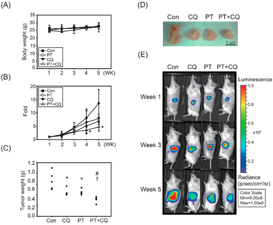 Combination of PT and CQ treatment enhances anticancer effects in the orthotopic pancreatic cancer model. MIA PaCa-2-Luc cells with luciferase activity were injected into the pancreas and administered with CQ (10 mg/kg) or PT (500 mg/kg)—alone or in combination—for 28 days. (A) Body weight in SCID mice was measured once per week. (B) Quantitative analysis of bioluminescence photon counts, as a measure of tumor growth throughout the entire experiment. * p < 0.05, compared to the control groups. (C,D) Measurement of tumor weight of orthotopic SCID mice after euthanasia. Data are presented as the mean ± SD (n = 5 mice/group). * p < 0.05 compared to the control groups; # p < 0.05 compared to the CQ treatment groups; † p < 0.05 compared to the PT treatment groups. Scale bar = 1 cm. (E) Quantification of tumor burden by measuring luciferase in the pancreas. Direct observation of SCID mice with tumors via in vivo imaging of luciferase activity in the pancreas.