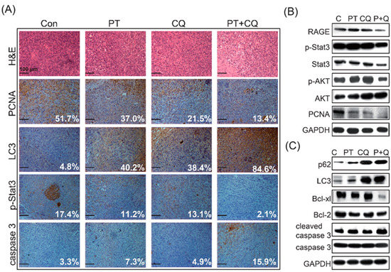 Immunohistochemical staining demonstrated that the fractions of PCNA- and p-STAT3-positive cells in the combined treatment groups were significantly less than those in the PT or CQ monotherapy groups (Figure 6A). Moreover, the combined treatment groups exhibited increased accumulation of LC3 and increased expression levels of cleaved caspase-3 (Figure 6A). Western blot analysis confirmed that combined treatment significantly reduced the expression levels of RAGE, p-STAT3, STAT3, p-AKT, and PCNA in tumor tissues compared to the PT or CQ monotherapy groups (Figure 6B). Moreover, inhibition of autophagy was detected via the accumulation of p62 and LC3, and increased expression levels of cleaved caspase-3 along with the decreased expression of Bcl-xl and Bcl-2 in tumor tissues indicated that apoptosis was significantly induced after combined treatment (Figure 6C).