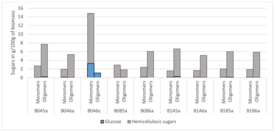 The amount of monomeric and oligomeric sugars present in the liquid filtrate after organosolv pretreatment was evaluated (Figure 1). The sample pretreated with acid catalyst (B0A6c) generated significant amounts of monomeric sugars, of which 11.54 g/100 gbiomass were from hemicellulose and 3.27 g/100 gbiomass were from cellulose. No oligomeric sugars of hemicellulosic origin were detected, whereas those derived from cellulose were only 1.07 g/100 gbiomass. These values evidence the extent of biomass hydrolysis during pretreatment. In contrast, pretreatment without acid catalyst released roughly three times more oligomeric than monomeric sugars. This trend could be advantageous as it would allow the separation of oligomeric sugars and their subsequent utilization for prebiotic production [22]. In addition, non-acid pretreatment resulted in the release of mostly hemicellulosic sugars and only small amounts of glucose. This finding supports the results of biomass composition, which indicated a superior selective removal of hemicellulose, but greater cellulose retention in pretreated solids in the absence of acid catalyst. Overall, 0.17 to 4.34 g/100 g cellulosic sugars and 4.06 to 11.54 g/100 g hemicellulosic sugars were released during pretreatment. The recovery of cellulose and hemicellulose in the liquid fraction was as high as 0.54–12.21% and 18.0–40.5%, respectively, and could be further improved by increasing the temperature to 200 °C or by using 50% instead of 60% ethanol.