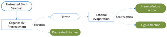 Figure 2 summarizes the overall process and the three fractions (pretreated biomass, solid lignin fraction, and hemicellulose liquid) obtained from untreated birch sawdust biomass. Cellulose, hemicellulose, and lignin are the three main compounds. The organosolv pretreatment separates these compounds into distinct fractions. Accordingly, the pretreated biomass should consist mainly of cellulose, lignin should be recovered in the solid lignin fraction, and hemicellulosic sugars should dissolve during pretreatment and remain in the hemicellulose liquid [10].