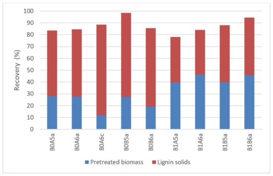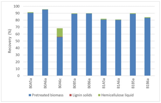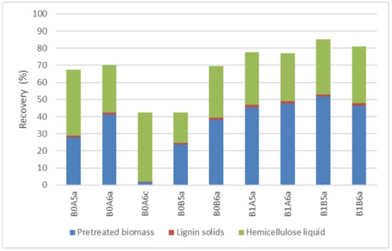 The recovery of cellulose was excellent, with most of it remaining in the pretreated biomass and only a residual amount being dissolved in the hemicellulose liquid, while trace amounts were detected in lignin solids (Figure 3). The use of acid during pretreatment lowered the total recovery of cellulose, as well as that from pretreated biomass. This can be attributed to the decomposition of cellulose to glucose (as evident also by the increased recovery of cellulosic sugars in the hemicellulose stream) and further breakdown of glucose into degradation products, which is promoted by the acid catalyst [23]. As a result, 55.8% of the recovered cellulose was present in the pretreated biomass, while 12.2% was dissolved in the hemicellulose liquid and trace amounts (0.3%) were found in the lignin fraction. On the contrary, in the absence of acid catalyst, more than 80% of cellulose was retained in the pretreated biomass fraction. The lowest cellulose recovery in the pretreated biomass (80.3%) was from samples pretreated at 180 °C for 15 min (B1A6a). Pretreatment at 180 °C resulted in biomass containing 80.3–89.1% cellulose; whereas pretreatment at 195–200 °C led to higher cellulose content (89.0–95.3%). The highest value (95.3%) was obtained following pretreatment at 200 °C, for 15 min, and with 60% ethanol solution (B0A6a). A minor amount of initial cellulose was recovered in the hemicellulose liquid (0.5–1.2%) and trace amounts were found in lignin solids (up to 0.3%). Overall, the decomposition of cellulose was significantly less pronounced in the absence of acidic catalyst.