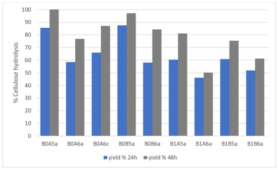 Organosolv pretreatment yielded a birch biomass with high cellulose content, which is convenient for downstream bioconversion processes, such as ethanol fermentation or biogas production [11,24]. However, the efficiency of enzymatic saccharification used in such processes depends also on the lignin and hemicellulose content, as well as on pretreatment conditions. Therefore, as shown in Figure 6, the conversion of cellulose to glucose was evaluated for each sample after 24 and 48 h using an enzyme load of 20 FPU/gbiomass (Cellic® CTec2). At both times, the yield was higher with biomass obtained following pretreatment with 50% rather than 60% ethanol solution. The highest yields, of 85.6% (24 h) and complete saccharification (48 h), were reached with biomass pretreated at 200 °C for 15 min in 50% ethanol solution (B0A5a), followed by a yield of 97.1% (48 h) achieved with the same treatment for 30 min (B0B5a). Generally, yields ranged around 75–90% after 48 h of enzymatic saccharification, with only samples pretreated at 180 °C and 60% ethanol achieving lower yields, such as 50.2% (B1A6a) and 61.4% (B1B6a). The use of an acidic catalyst improved the cellulose content, as well as the removal of lignin and hemicellulose sugars; the same trend was observed also during saccharification, with an increase of 12.6% at 24 h and 13.5% at 48 h compared to the same pretreatment without catalyst. These results suggest that the catalyst would cause more issues than advantages when scaling up the process, such as corrosion of the equipment and environmental pollution.