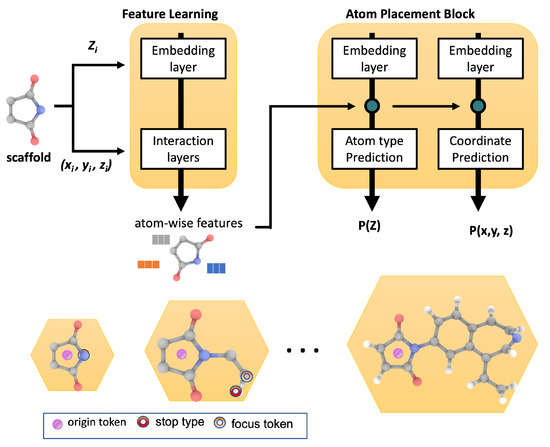 - Joshi, R.P.; Gebauer, N.W.A.; Bontha, M.; Khazaieli, M.; James, R.M.; Brown, J.B.; Kumar, N. 3D-Scaffold: A Deep Learning Framework to Generate 3D Coordinates of Drug-like Molecules with Desired Scaffolds. J. Phys. Chem. B 2021. [Google Scholar] [CrossRef] [PubMed]