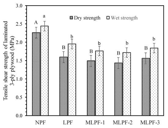 Bonding strength of 3-ply plywoods bonded by the adhesives is displayed in Figure 3. In contrast to the reported data, wet strength is higher than the corresponding dry strength for all the adhesives, even after 180 min of cooking of the plywood specimens in boiling water. This could be due to the further curing or cross-linking reaction of adhesives as well as the complete release of interior stress in the glueline during the cooking process. NPF adhesive can withstand up to 2.26 MPa and 2.44 MPa of tensile shear stress at dry and wet conditions, respectively. Lignin introduction into phenolic adhesives reduces the bonding strength when applied for plywoods. LPF displays a tensile shear strength of 1.59 MPa and 1.95 MPa at dry and wet conditions, respectively. For the associated MLPF-1, the bonding strength at dry and wet conditions is 1.49 MPa and 1.76 MPa, respectively. Lignin methyolation does not contribute to increased bonding strength compared with LPF. Addition of ML into adhesive at the second stage of adhesives synthesis results in further decreased bonding strength of 1.43 and 1.71 MPa at dry and wet conditions. While direct blending of ML and NPF for adhesive purpose contribute to comparable dry and wet bonding strength of 1.55 MPa and 1.84 MPa. Despite the above observations, lignin-based adhesives all meet the requirement for ASTM standard. Honestly significant difference analysis demonstrated that difference between bonding strength of NPF and any lignin based adhesive is significant. Meanwhile, regardless of methylolation or adding stage, difference among the lignin based adhesives is not significant as far as the bonding strength is concerned.