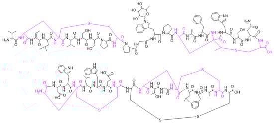 - Arnison, P.G.; Bibb, M.J.; Bierbaum, G.; Bowers, A.A.; Bugni, T.S.; Bulaj, G.; Camarero, J.A.; Campopiano, D.J.; Challis, G.L.; Clardy, J.; et al. Ribosomally Synthesized and Post-Translationally Modified Peptide Natural Products: Overview and Recommendations for a Universal Nomenclature. Nat. Prod. Rep. 2013, 30, 108–160. [Google Scholar] [CrossRef] [PubMed]