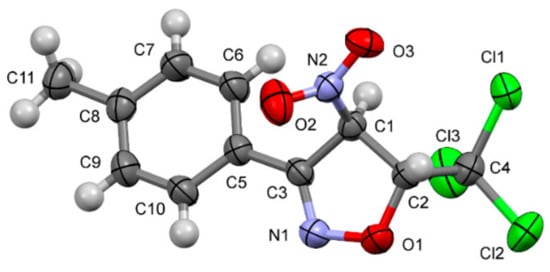 For post-analysis, HR-MS data were analyzed first. It was found that the isolated compound (3a or 4a) gave a pseudo-molecular ion 320,9601mDa [M-H]− (see Supplementary Materials) which corresponds with the proposed C11H8N2O3Cl3 molecular formula. Bands typical for the NO2 group [35], -N-O- [11,36], and -C=N- [11] moieties in the heterocyclic ring as well as C-Cl bond [35] vibrations were detected in its IR spectrum. Information about stereochemistry of the isolated compound was provided by 1H NMR spectroscopy. Protons associated with the isoxazoline ring form AX spin system. The values of J 4,5 isoxazoline ring coupling constants are found in the range of coupling constants typical for isoxazolines substituted at the 4- and 5- positions with trans configuration of the substituents.