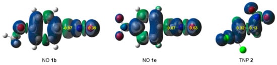 One appealing procedure that provides a straightforward connection between the electron density distribution and the chemical structure is the quantum chemical analysis of Becke and Edgecombe’s Electron Localization Function (ELF) [37]. Thus, to gain insight about the reactivity of the reagents involved in the aforementioned 32CA reactions, their electronic structure was characterized through the topological analysis of the ELF and Natural Population Analysis (NPA) of their charge distribution. Herein, only the results for NOs 1b and 1e, and TNP 2 are commented on (Figure 2), while those for the three remaining NOs are given in Table S4 in Supplementary Material.