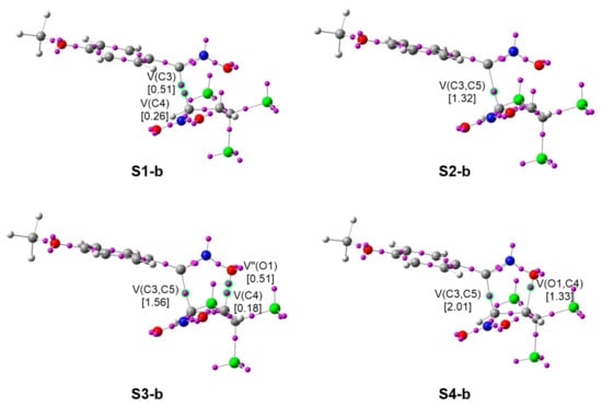 Analysis of the bonding changes along the 32CA reactions of NOs 1b,e with TNP 2 shows very similar bond formation processes, regardless of the substitution of the TAC. This behavior is in agreement with the similar electronic structures of these NOs (see Section 2.2.1). At the two TSs, both the N2-C3 and C4-C5 bonding regions have been depopulated with respect to the separated reagents (see Section 2.2.1) to 4.29 (TS-o-b) and 4.40 (TS-o-e) ē, which can already be considered a double bond and an overpopulated single bond, respectively, but no pseudoradical center is observed yet. Further approach of the two molecular frameworks leads to the creation of pseudoradical centers at the three carbon atoms involved. At S1, the two C3 and C5 pseudoradical centers reach populations of ca. 0.5 and 0.8 ē, just before merging each other at S2 to give rise to the formation of the first C3-C5 single bond, at a C-C distance of ca. 1.97 Å, with an electron population of 1.48 (S2-b) and 1.33 (S2-e) ē. At S3, right before the formation of the second O1-C4 single bond, the non-bonding electron densities associated with both the O1 oxygen and the C4 carbon reach ca. 5.74 and 0.19 ē. At S4, formation of the O1-C4 single bond takes place at an O-C distance of ca. 1.76 Å by donation of ca. 0.6 ē of the O1 oxygen electron density to the C4 pseudoradical center, whose population has slightly decreased to ca. 0.2 ē. The new O1-C4 bond has a population of ca. 0.8 ē. At the final isoxazolines 3b,e, the O1-C4 and C3-C5 bonds reach ca. 1.34 and 2.02 ē. As formation of the second O1-C4 single bond occurs when the first C3-C5 formed bond has already reached 78% (1b) and 83% (1e) of its final population at 3b,e, it can be considered that these polar zw-type 32CA reactions follow a two-stage one-step mechanism [64]. Indeed, the evolution of the forming bond distances is considerably synchronous (Table 4 and Table 5), thus emphasizing that geometrical analyses are not valid to characterize the stage of the bond formation progress.