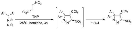 In other cases, the presence of the CCl3 group is not enough to stabilize the corresponding cycloadduct. For instance, diaryldiazomethanes react with TNP yielding unstable 5-nitropyrazoline systems, which surprisingly converted very fast into the corresponding 4-dimethylvinylpyrazolines via hydrochloride extrusion (Scheme 3) [24,25]. It should be underlined at this point that the HCl extrusion from molecular systems including the CCl3 group is very rare and was unobserved earlier in five-membered heterocycles.