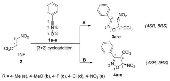 Likewise, the other 32CA reactions involving NOs 1b–e were explored. In all cases, only 3-aryl-4-nitro-5-trichloromethylisoxazolines (3b–e) were isolated and identified by spectral analyses.
