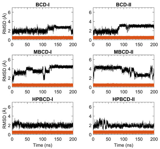 For stability analysis of plumbagin and hosts molecules, the all-atom root-mean-square deviation (RMSD) of plumbagin and BCDs were plotted using red and black lines, respectively, as shown in Figure 1. The all-atom RMSD of the host’s molecules presented higher deviation than plumbagin molecule, as the consequence of the difference in molecular size and chemical structure. Plumbagin is a naphthoquinone that has limited structural flexibility; thus, its structural deviation throughout the whole MD simulation was small and steady (RMSD of 0.1 to 0.9 Å); meanwhile, hosts molecules—which are cyclic oligosaccharides with seven glucose units—lead to a higher degree of structural motions, especially when there are substituted functional groups on the rims of a truncated cone (e.g., MBCD and HPBCD).