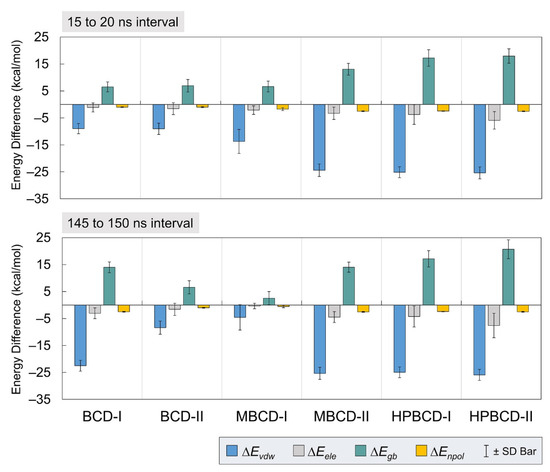 In Figure 4, all inclusion complexes during both stable intervals showed negative van der Waals and electrostatic contributions in gas phase energy; however, they showed small negative electrostatic and highly positive nonpolar contributions in solvation-free energy. Therefore, all inclusion complexes complied with the typical phenomena, which are the favorable interaction energy in the gas phase and unfavorable solvation-free energy. The reason that most systems would have unfavorable solvation-free energy is that this energetic contribution refers to the de-solvation process of bound molecules from solvated space and restoring the binding interface. It was also very clear that the leading contribution for host–guest binding in all plumbagin–BCDs inclusion complexes was van der Waals interactions.