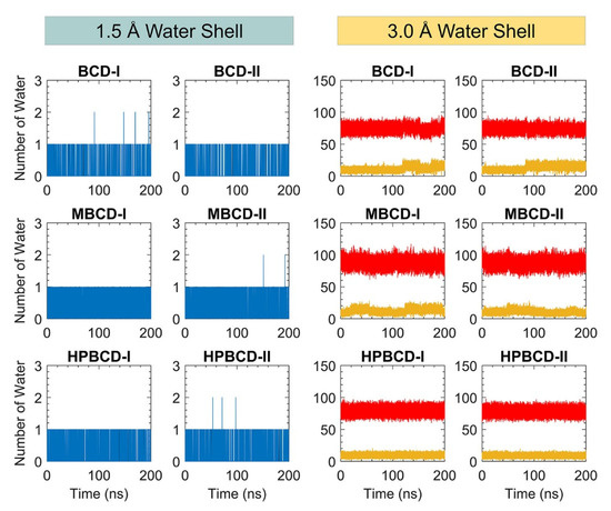 In addition, the dynamic of water molecules around inclusion complexes are investigated to gain more understanding about the role of the water molecule in binding and release states of plumbagin. The water molecule counting around inclusion complexes could represent the dynamic of water molecules and indicate the difference in the water network between binding and release states. However, the total number of water molecules inside the periodic box is large, and distant water molecules should not have significant interaction with the inclusion complexes. Therefore, two layers of spherical water shell were separately defined around BCDs and plumbagin molecules, with a radius of 1.5 and 3.0 Å. The number of water molecules inside both water shells was collected throughout 200 ns simulations, as shown in Figure 7.