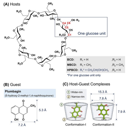 The crystalline structure of plumbagin, BCD, MBCD, and HPBCD were downloaded from Cambridge Crystallographic Data Centre [21] with the Cambridge Structural Database (CSD) entry, listed as follows: PVVAQS01 [22], BCDEXD03 [23], BOYFOK04 [24], and KOYYUS [18] (Figure 8A,B). BCD and its derivatives consist of seven glucose units, the hydrophilic outer surface originated from primary and secondary functional groups located on the rims of cyclic-oligosaccharides (Figure 8A) [25]. All cyclodextrins have truncated cone shapes, which comprise a wider rim and a narrow rim, as sketched in Figure 8C. For BCDs, the wider rim is defined by the secondary hydroxyl group attached to C2 and C3 atoms or substituted functional groups attached to O2 atom. The narrow rim is defined by the primary hydroxyl group attached to C6 atom or substituted functional groups attached to O6 atom.