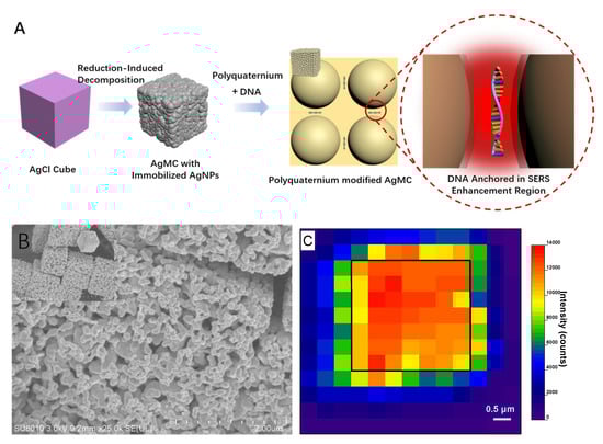 The following are available online: Figure S1: The SEM images of the morphology of the AgCl cubes, Figure S2: (A–E) The SERS images of different degrees of reduction. The AgCl cubes were reduced by 10−1 (A), 10−2 (B), 7 × 10−3 (C), 10−3 (D) and 5 × 10−4 M (E) concentration of NaBH4, respectively. AgNPs are the first to form fine particles on the surface (E), the adjacent AgNPs continue to aggregate to form larger particles (B, C, D), and finally form AgMC with a smooth surface (A), while increasing the concentration of the reducing agent NaBH4, Figure S3: The EDS spectrum of the unreduced AgCl cubes (A) and the AgMC was reduced by 7 × 10−3 M NaBH4 (B), Figure S4: (A) The Raman intensity of the AgCl cube was reduced by different concentrations of NaBH4 in the detection of 5 × 10−5 M of SS1. (B) Statistical analysis of the size of the AgNPs in a single AgMC, Figure S5: The Raman intensity of the AgMC were modified with different charges in the detection of 5 × 10−5 M SS1, Figure S6: The Raman spectrum of 20 Ag cube in the detection of 5 × 10−5 M SS1, Figure S7: Statistical analysis and distribution of SERS detection of different kinds of ions in DNA solution, Table S1: EDS statistical data of the AgCl cube and the AgMC reduced by 7 × 10−3 M NaBH4, Table S2: Peak assignment in DNA spectrum.