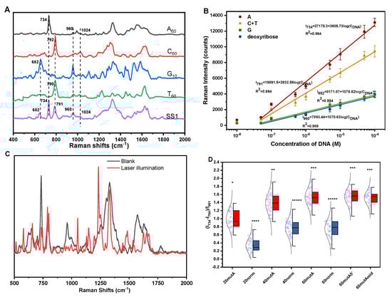 High sensitivity is a major feature of SERS, according to the peak assignment as described above> Here, we studied the linear range in DNA detection using this SERS substrate. As shown in Figure 2B, we plotted the correlation curve of the characteristic peak intensities of each base and deoxyribose (dR) as the concentration of 60–nt DNA. When there is a high concentration of DNA (10−4 M) in the solution, due to the stronger electrostatic effect, the domination by the Stokes mode of adenine does not occur, which is caused by the orientation of DNA extended from the metal surface [3,4]. However, taking the strongest peak of 734 cm–1 as a reference, the benefit from the synergic effect of the AgMC and polycationic molecules, the detection limit of 60-nt DNA reaches 6.7 × 10−8 M (3σ/S). Since we only needed 10 μL of DNA solution to complete detection, in actuality, the SERS signal coming from 1.24 × 103 DNA molecules was successfully detected, Section S4 in the Supplementary Materials. Further evidence comes from the observation of a sudden spectra change (Figure 2C). Photochemical decomposition or photobleaching was significantly reduced due to extremely few molecules adsorbed on the metal surface. After the DNA molecules adsorbed on the surface of AgMC were irradiated by the laser (λ = 633 nm) for 3 min, the spectra changed considerably, e.g., the peaks at 734 and 790 cm–1 happened to split into two. Since adenine adsorbed more firmly on the metal surface than the other bases, the peak intensity of adenine decreased considerably as well. At the same time, due to the strong effect of photochemical reduction, the peak of deoxyribose disappeared and the peak intensity of the phosphate group (1050 cm–1) became strong.