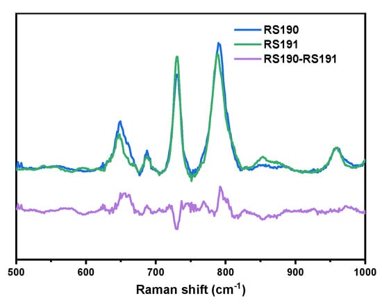 Although this method cannot distinguish the position of a specific base, it can effectively detect single-base mutations of genes. The specific-sequence oligonucleotide probe is a widely used technique for the detection of genetic mutations, and it has been proven that the optimal oligonucleotide length for best sensitivity and specificity ratios in transcriptome studies is 60–mers [2]. To reflect the potential of poly@AgMC in the detection of hereditary diseases, here, we chose to detect two kinds of gene mutations of the 60-nt sequence DNA related to the synthesis of beta-globin. The error transcription will cause globinogenesis anemiawe, which is also known as beta-thalassemia [32]. As shown in Figure 3, the spectrum of the two kinds of mutations was normalized by the peak intensity at 960 cm–1. The difference between RS190 and RS191 is that the former has one G and one C base more, but one A and one T base less; thus, the 734 cm−1 intensity of RS190 is lower than RS191, and the 652 cm–1 intensity is stronger. At the same time, although the characterization peak of C and T overlap, the Raman activity of C and T is different [3], which leads to the 791 cm−1 intensity of RS190 being stronger than RS191.