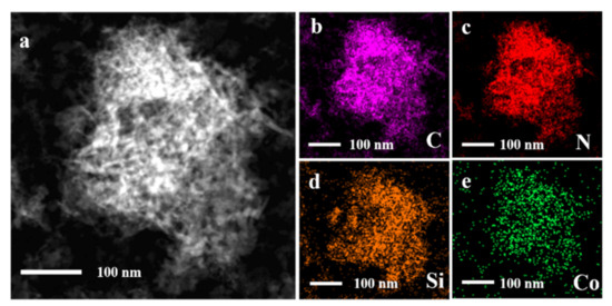 (a) TEM image of Co-N-Si/AC and (b–e) the corresponding elemental mapping of C, N, Si and Co, respectively.