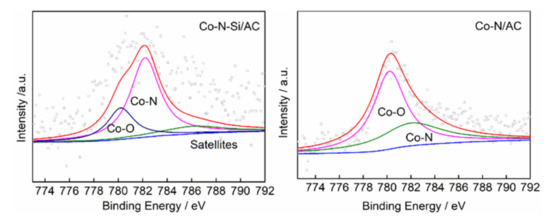 XPS spectra of Co2p in Co-N-Si/AC (left) and Co-N/AC (right).