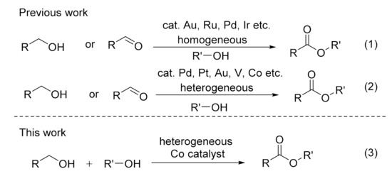Esters are a significant part of the building blocks in organic synthesis that are widely applied in pharmaceuticals, fine chemicals, natural products, fragrances and commercial products [1]. In recent decades, a great deal of research effort has been devoted to developing environmentally benign and cost-effective methods for the synthesis of esters from alcohols. This is easily accessible and of increasing importance as renewable plant-derived feedstock [2]; as alternatives for traditional protocols such as noble-metal-based homogeneous catalytic system such as gold, ruthenium, palladium and iridium [3,4,5,6,7,8,9,10,11]; and for the exploration of heterogeneous (palladium, platinum, gold, vanadium and cobalt supported) catalysts [12,13,14,15,16,17,18,19,20,21,22] (Scheme 1). Although these utilities are of significant practical importance, they always bear one or more shortcomings such as long reaction times, the use of precious metal catalysts, harsh reaction conditions and poor selectivity. Of all these protocols, direct oxidative esterification of alcohols with molecular oxygen catalyzed by heterogenous catalysts (ideally based on a non-noble metal) may be the most favored and promising for many reasons: (i) the use of oxygen as an oxidant reagent is green, economical and sustainable; (ii) the recyclability and reusability of heterogenous catalysts; (iii) the ease of separation; (iv) the ease of accessibility and renewability of alcohols; (v) the replacement of a noble metal with a base metal; etc. Moreover, an increasing emphasis on the development of cost-effective and environmentally friendly processes for the chemical industry is leading to continuous interest in the search for suitable catalytic systems for such transformations. Therefore, the exploration and development of efficient catalytic systems for oxidative esterification under mild conditions are of increasing interest in both green chemistry and organic synthesis.