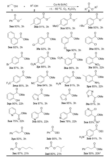 Co-N-Si/AC-catalyzed oxidative esterification of alcohols a. a Reaction conditions: 1 (0.5 mmol), 2 (1.5 mL), catalyst (40 mg, 1.75 mol%), 0.1 mmol K2CO3, at room temperature for 3–22 h under O2; b 60 °C; c 80 °C.