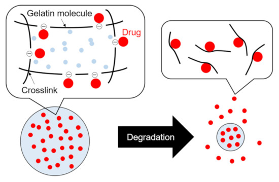 A schematic representation of drug release from gelatin particles (when the isoelectric point of gelatin is negative.). The gelatin used for sustained drug release can be selected considering the isoelectric point of the drug (If the drug to be released is basic, gelatin with a negative charge is preferable.). Drugs and gelatin molecules interact by physicochemical interaction (e.g., ionic or hydrogen interaction). When the gelatin particles are degraded, the drugs with gelatin molecule debris are rapidly released with time.