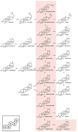 Cation rearrangement involved in the production of friedelin and other triterpenes [10]. Pink highlighted area represents the route of production of friedelin.