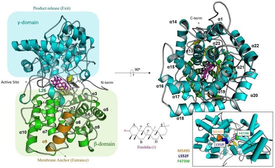The molecular modeling of the globular monomeric friedelin synthase from M. ilicifolia was previously described [19]. It is formed by 23 α-helices, giving the topology presented in Figure 3, and is subdivided into two α/α domains known as βγ, which are similar to domains found in G βγ complex proteins. This monotopic membrane protein is connected to the bilayer structure through an α-helices (α9), which is where the substrate enters. After rearranging the internal α/α barrel in the β-domain, the solvent channel formed throughout the 65 Å diameter structure directs the substrate to the active site localized between domains. Each α/α domain is connected by type I β-hairpins, small α-turns and extended loops, considering the N-/C-terminal region of the secondary structures that surrounds the center of the subunit interface and close the reaction site. Second, the β-domain comprises an α/α barrel responsible for starting the cyclization reaction after protonation of the prefolded friedelyl cation from Asp484 located in the conserved DCTAE (Asp-Cys-Thr-Ala-Glu) motif. The region of the catalytic site comprises a triad of β-hairpins, and the flexibility of those loops enables the rearrangement of the substrate inside the catalytic site.
