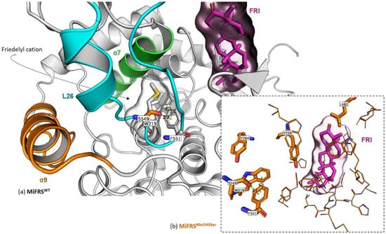 Secondary alignment (or side-by-side representation) of the wild protein (MiFRS) (grey stick carbons) with MiFRSMet549Ser mutant (orange stick carbons). The surface highlights the volume adopted by the friedelin molecule in the catalytic cavity. Colored cartoons represent important protein regions: i. membrane contact α9 (orange), ii. barrel center entrance, helix α7 (green) and iii. catalytic loop L26. (a) The native Met549 occupies the route for the substrate achieves the catalytic. On the other hand, the single mutation Met549Ser stabilizes aromatic residues Tyr264 and Trp219; anion-π interaction between hydroxyl of Ser549 residue and the Phe551 residue is created. Interactions between the Tyr264 and Trp219 residues and the anion at the Ser549 mutated residue keep the site opened near ring C. (b) Stabilization of the Ser549/Phe551/Trp219/Tyr264 complex. The anion-π interaction is distanced by 2.7 Å, whereas the T-shaped π-π interaction is 4.3 Å closed.