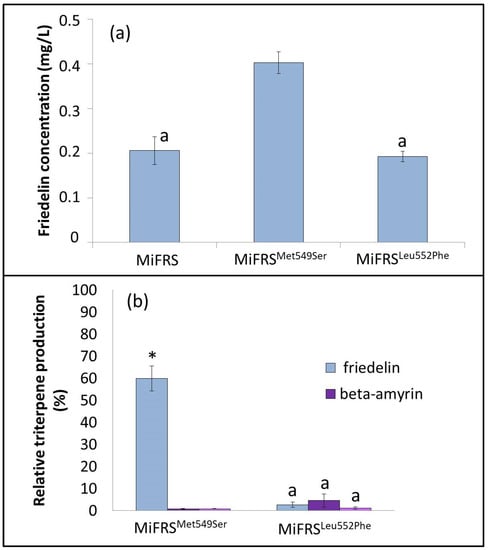 Concentration of friedelin in fractions extracted from S. cerevisiae yeast, expressing MiFRS mutants. (a) Concentration of friedelin is expressed in mg/L of culture medium. (Complementary Data in Supplementary Material, Table S4). (b) Proportion between friedelin, β-amyrin and α-amyrin produced in the mutants of MiFRS. A statistically significant difference is indicated by one asterisk (*) on the top of the bar, after analysis of variance. Bars with the same letter denote an absence of a statistically significant difference between each other on the quantification friedelin in the respective season (p > 0.05; one-way ANOVA with Tukey’s test).