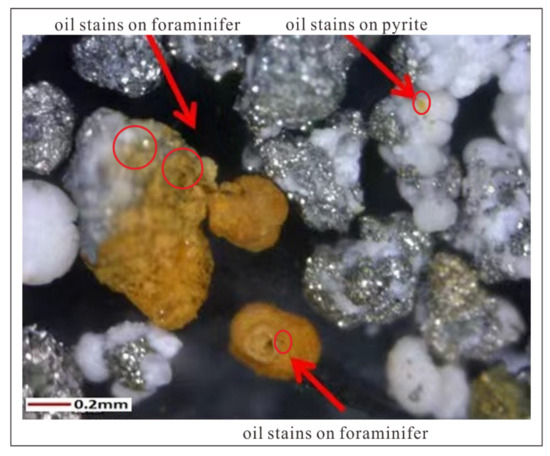 Oil stains in sample 2 from core GMGS4-XH-W03B. Red arrows reflect the direction indicated by the comment text; red circles suggest the locations of oil stains.