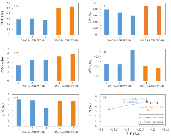 The TOC and TN contents, C/N ratios, and δ13C and δ15N values are presented in Table 2 and Figure 3. The TOC contents of the samples from cores GMGS4-XH-W03B and GMGS4-XH-W06B are about 0.30% and 0.50%, respectively. The TN contents in the samples from two cores range from 0.06% to 0.09%. The atomic C/N ratios in the samples from core GMGS4-XH-W03B are at the interval of 3.46 to 4.65; while those for core GMGS4-XH-W06B range from 5.40 to 6.00. The difference between the C/N ratios of both core samples is mainly due to their TOC contents rather than TN contents. The δ13C and δ15N values of the samples from core GMGS4-XH-W03B are in the range of −23.65‰ to −22.20‰ and 3.43‰ to 5.08‰, respectively; whereas those for core GMGS4-XH-W06B are from −22.07‰ to −21.81‰ and 4.68‰ to 4.71‰, respectively. As a whole, the TOC and TN contents and C/N ratios in the studied samples are nearly similar, but those in the samples from core GMGS4-XH-W06B are slightly higher. Except sample 3 in core GMGS4-XH-W03B, both δ13C and δ15N values are comparable in the two cores. In addition, a strong positive correlation between the δ13C and δ15N values exhibits for our data set (Figure 3f). For the bulk organic carbon/nitrogen and their stable isotope values, it is interesting that there is no difference in the sample with oil stains.