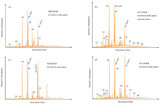 GC-MS chromatograms showing the distribution of fatty acids in sediments from (a–c) core GMGS4-XH-W03B and (d) core GMGS4-XH-W06B. Arabic numerals denote the numbers of carbon atoms. 18:1ω9 and 22:1ω13 refer to C18:1ω9 and C22:1ω13 mono-unsaturated fatty acids. The symbols i- and ai- represent iso-C14:0, iso-C15:0, anteiso-C15:0, and iso-C16:0, respectively.