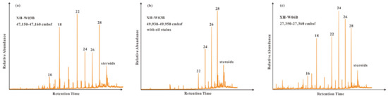 GC-MS chromatograms showing the distribution of n-alkanols and steroids in sediments from (a,b) core GMGS4-XH-W03B and (c) core GMGS4-XH-W06B. Arabic numerals indicate the numbers of carbon atoms.