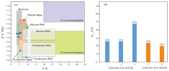 For the studied area, we adopted −27‰ and −20.5‰ as the terrestrial and marine end-member values respectively, as reported by Hu et al. [34]. The calculated relative percentages of terrestrial organic matter in the studied sediments are presented in Table 2 and Figure 7b. The estimated result (the ratios at the interval of 20% to 48%) indicates that the contribution of terrestrial organic matter is relatively low (except sample 3 from core GMGS4-XH-W03B), which is consistent with the conclusion mentioned above.