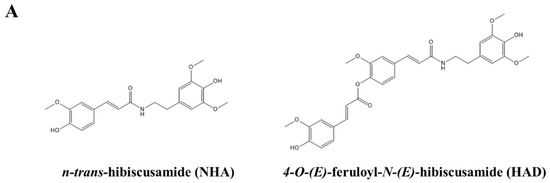 In this study, we investigated the effects of NHA and its derivative 4-O-(E)-feruloyl-N-(E)-hibiscusamide (HAD), which is obtained from the NHA synthesis process, on osteoclast differentiation in bone marrow-derived macrophages (BMMs) and showed the anti-osteoporotic effects of these compounds using an ovariectomy (OVX)-induced osteoporosis mouse model.
