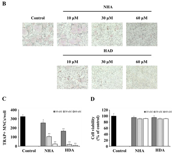 Osteoclasts are differentiated from BMMs and exhibit bone resorption activity. TRAP is a marker of mature osteoclasts and is often used to identify osteoclasts. To examine whether NHA and HAD (Figure 1A) inhibit RANKL-induced osteoclastogenesis, an osteoclast differentiation assay using TRAP staining was performed. TRAP-positive multinucleated cells with more than three nuclei were counted. The number of TRAP-positive multinucleated cells significantly decreased in a dose-dependent manner in response to NHA and HAD (Figure 1B,C). To confirm whether this result was due to cytotoxicity, an XTT assay was performed. However, there was no cytotoxicity (Figure 1D).