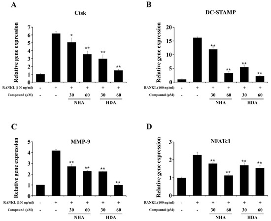 NFATc1 forms a complex with activator protein 1 (AP-1), which is an essential transcription factor associated with osteoclastogenesis, to efficiently induce osteoclast-specific genes such as Ctsk, dendrocyte-expressed seven transmembrane protein (DC-STAMP), MMP-9, and NFATc1 [24,25,26]. To confirm that NHA and HAD affect the transcription factor NFATc1 and the expression of osteoclast-specific genes, quantitative real-time RT-PCR analysis was performed. NHA and HAD significantly decreased all osteoclast differentiation genes in a dose-dependent manner (Figure 2).