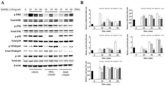 Inhibitory effect of NHA and HAD on the RANKL-induced signaling pathway. (A) BMMs were seeded in six-well plates and treated with RANKL (100 ng/mL) for the indicated times after being pretreated with 30 μM NHA and HAD. Then, the cells were collected and subjected to Western blot analysis using the indicated antibodies. (B) The optical densities of the bands were calculated by ImageJ software. The results are presented as the mean ± SD of three individual experiments. * p < 0.05, ** p < 0.01 compared with the RANKL-only group.