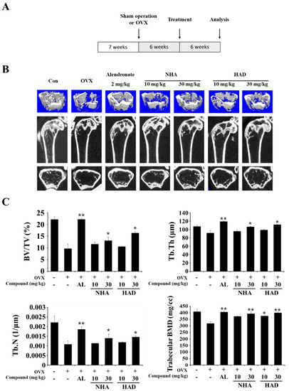 Detailed procedures are described in a previous study [39]. In brief, six-week-old female C57BL/6 mice were purchased from OrientBio (Seongnam, Korea). After being acclimatized for one week, the mice underwent a sham operation or bilateral OVX under anesthesia. The mice were maintained without any treatment for 6 weeks after surgery until bone loss was apparent. After 6 weeks, NHA, HAD, and alendronate were dissolved in 10% DMSO containing PBS and intraperitoneally injected into the appropriate groups every 2 days for 6 weeks. The mice were randomly divided into 6 groups (n = 6 mice per group): sham-operated mice (SHAM), OVX mice treated with vehicle (OVX), OVX mice treated with 2 mg/kg alendronate (ALN), OVX mice treated with NHA (10 mg/kg or 30 mg/kg), and OVX mice treated with HAD (10 mg/kg or 30 mg/kg). Alendronate was used as positive control. The animal experimental protocols were approved by the Institutional Animal Care and Use Committee of Korea Research Institute of Bioscience and Biotechnology (permission number # KRIBB-AEC-20149), and all mice were handled in accordance with the Guide for the Care and Use of Laboratory Animals published by the US National Institutes of Health.