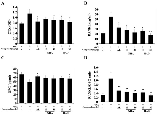 Biochemical analysis of NHA- and HAD-treated ovariectomized mice. The serum levels of (A) CTX, (B) RANKL, (C) OPG, and (D) RANKL and the OPG ratio were analyzed by ELISA. The data are expressed as the means ± SD * p < 0.05, ** p < 0.01 compared with the OVX-only group.