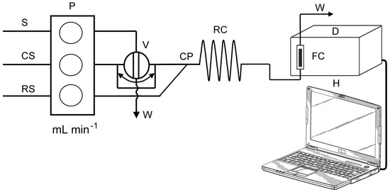 Schematic diagram of the flow injection manifold: S—standard solution, CS—carrier (ultra pure H2O), RS—reagent (reagents depends on the ligand), P—peristaltic pump, V—injector valve (loop = 500 µL), CP—confluence point, RC—reaction coil (i.d. = 0.8 mm), D—spectrophotometric detector equipped with flow cell (FC), (VFC = 160 µL), H—computer, W—waste.
