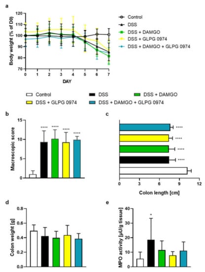 To investigate the possible synergistic anti-inflammatory effect of a MOR agonist DAMGO and a FFAR2 antagonist GLPG 0974 in the mouse GI tract, we used a well-known mouse model of colitis induced by DSS which mimics UC. As shown in Figure 1, animals exposed to DSS developed a severe colonic injury, evidenced by—among others—increased macroscopic damage score and elevated MPO level compared with controls. DAMGO (0.02 mg/kg BW) and GLPG 0974 (1 mg/kg BW), injected once daily did not influence BW loss (Figure 1a), macroscopic score (Figure 1b), colon length (Figure 1c) and colon weight (Figure 1d). However, the co-administration of DAMGO and GLPG 0974 non-significantly decreased MPO activity as compared to DSS group and the compounds alone (Figure 1e).