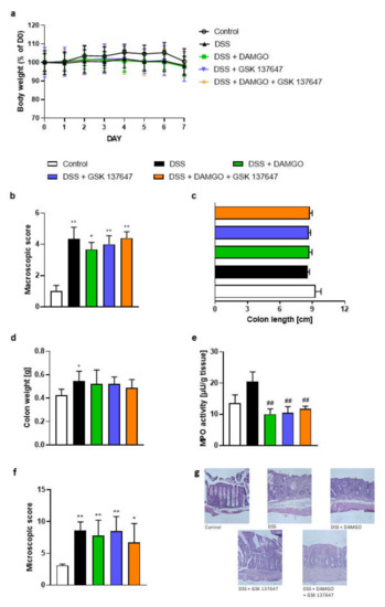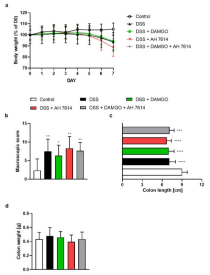 MOR agonist DAMGO at the dose of 0.02 mg/kg BW and FFAR4 agonist GSK 137647 at the dose of 1 mg/kg BW were administered i.p. twice daily from day 3 to day 6. Clinical and macroscopic indicators of colitis, such as BW loss (Figure 4a), macroscopic colon damage score (Figure 4b), colon length (Figure 4c) and colon weight (Figure 4d), were not altered as compared to DSS-treated group.