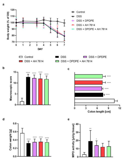 To test the anti-inflammatory activity of DOR agonist DPDPE and FFAR4 antagonist AH 7614 in the mouse model mimicking UC, a DSS-induced colitis was used. The i.p. administration of DPDPE (0.3 mg/kg BW) and the i.p. administration of AH 7614 (1 mg/kg BW), both twice daily between days 3 and 6 did not induce any improvement in the disease score, as demonstrated by the BW loss (Figure 3a), macroscopic colon damage score (Figure 3b), colon length (Figure 3c), colon weight (Figure 3d) and MPO activity (Figure 3e).