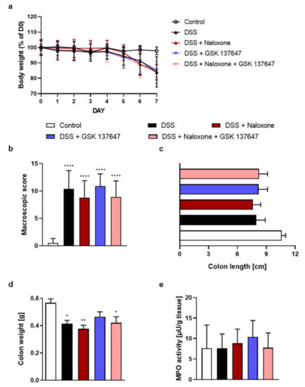 The i.p. administration of opioid receptor antagonist naloxone and FFAR4 agonist GSK 137647 (from day 3 to day 6, both 1 mg/kg BW, twice daily) did not alleviate symptoms of DSS-induced colitis in mice. Figure shows data for body weight loss (a), macroscopic score (b), colon length (c), colon weight (d) and MPO activity (e). * p < 0.05, ** p < 0.01 and **** p < 0.0001 as compared to control mice. Data represent mean ± SEM of 5–10 mice per group. Abbreviations: DSS—dextran sulfate sodium, FFAR4—free fatty acid receptor type 4, i.p.—intraperitoneally, MPO—myeloperoxidase.