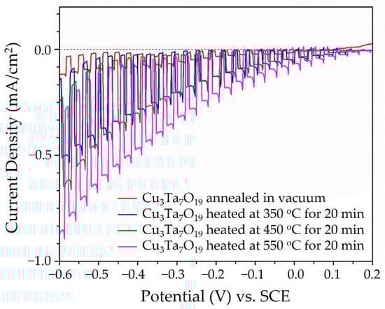 Chronoamperometry (−0.25 V applied bias versus SCE) in aqueous 0.5 M Na2SO4 solution at pH ~ 6.3 under chopped visible light irradiation for Cu3Ta7O19 films annealed in a vacuum at 500 °C (black), and after heating in air for 20 min at 350 °C (red), 450 °C (green), and at 550 °C (blue).