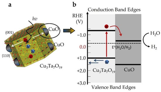 The oxidation of Cu(I) to Cu(II), occurring both at the surface and in the bulk, yielded much higher photocurrents for the Cu(3−x)Ta7O19 films. This result is surprising given the high concentration of Cu-site vacancies, of up to 50%, that formed when heating in air at 450 to 550 °C. Prior work on Cu(I)-containing semiconductors has shown that the phase segregation of CuO at the surface can result in a favorable band-energy offset to drive more efficient charge separation, such as in Cu(3−x)VO4 and CuBi2O4 [6,21]. For p-type Cu3Ta7O19, its band edge energies were determined from Mott–Schottky measurements that yielded a flat band potential of +0.36 V (versus SCE at pH = 6.3). This gave band edge energies of −1.57 V and +0.73 V for the conduction and valence band edges, respectively. The conduction band edge is therefore located at a significantly more negative potential than for CuO, which occurs at about −0.8 V (+/− 0.1 V) at pH ~ 6.0 versus SCE [16,26]. The offset of the conduction band edges thus facilitates the diffusion of minority carriers from p-type Cu3Ta7O19 to CuO, followed by the reduction of protons to dihydrogen at the surfaces of the latter, as illustrated in Figure 6. Conversely, the valence band edge of Cu3Ta7O19 is located at a more negative potential than in CuO, inhibiting the concomitant hole migration to the surfaces of CuO. Thus, a favorable type-II band offset is formed between p-type CuO and Cu3Ta7O19, as shown in Figure 6, yielding a net diffusion of electrons to the surfaces and an increased charge separation efficiency.
